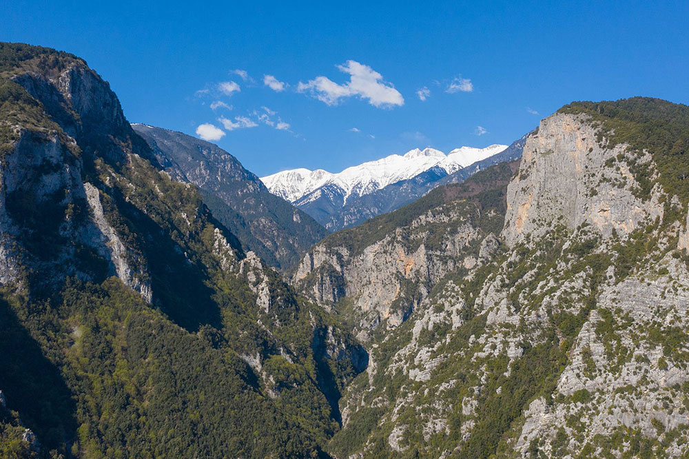 Olympus, "the mountain of the gods", the source of ancient myths and the highest mountain in Greece, dominates the borders of Thessaly and Macedonia with its imposing, solid mountain mass. Full of deep ravines, high peaks that reach up to 2,918 meters ("Mytikas" peak), and countless paths from which many brave people have walked, the first National Park of the country, an area with great biodiversity, stands like a giant tower, with its circular shape that extends to a perimeter of 150 kilometers.