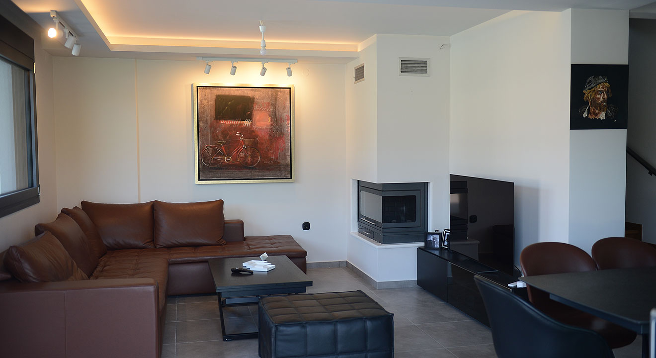 - Χώρος Καθιστικού: Άνετο, καλαίσθητα διακοσμημένο καθιστικό με δερμάτινους καναπέδες Bo Concept, με τζάκι, τραπεζαρία, πίνακες υψηλής αισθητικής και smart τηλεόραση επίπεδης οθόνης 65″.